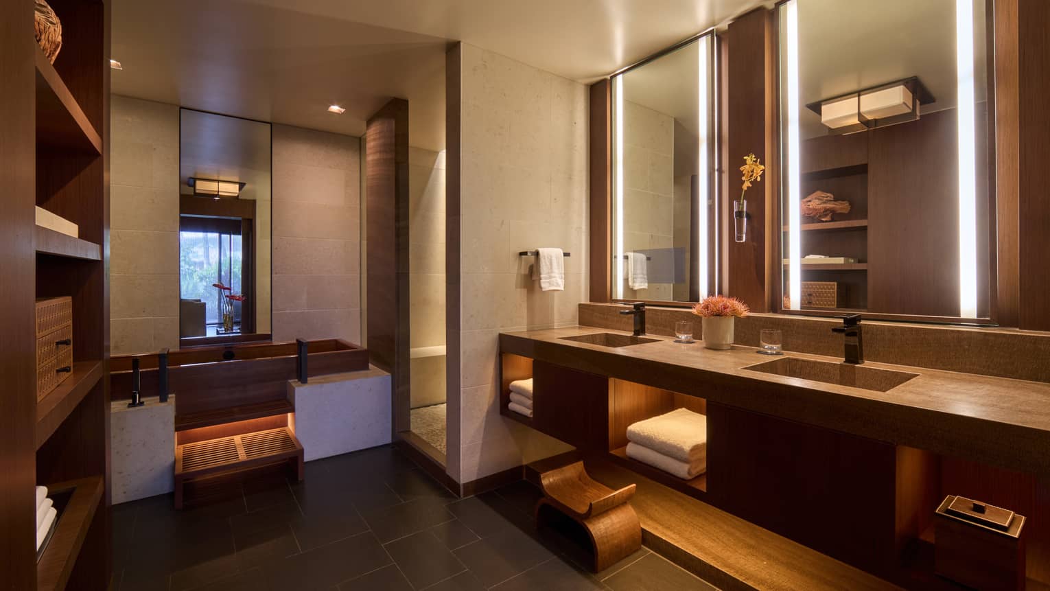 마스터 욕실에 일본식 나무 욕조, 정원으로 연결되며 안락 의자와 2인용 테이블을 갖춘 전용 테라스, 투베드룸 스위트로 세팅 가능