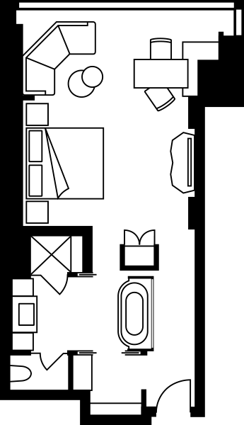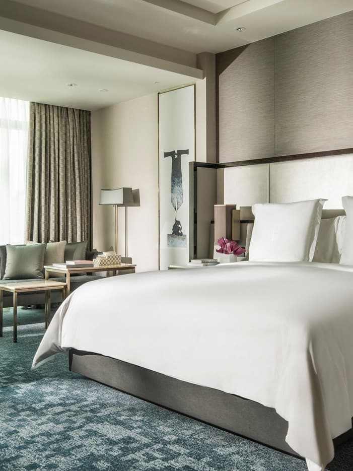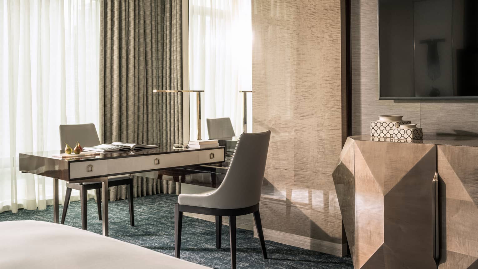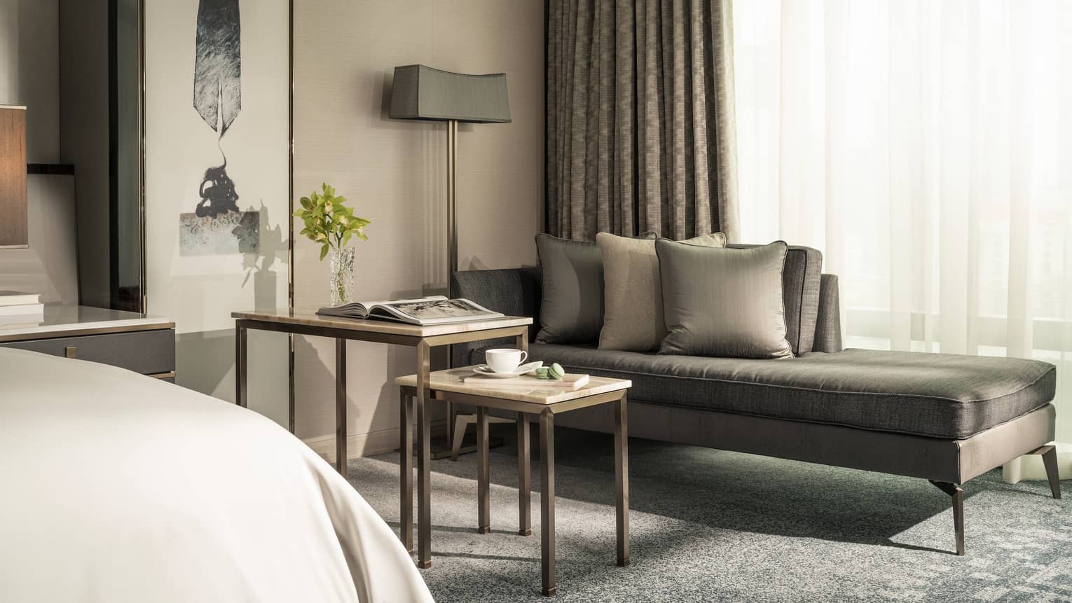 Relax on the windowside chaise longue and enjoy views of the pool terrace and city skyline from the comfort of this spacious and perfectly appointed room.