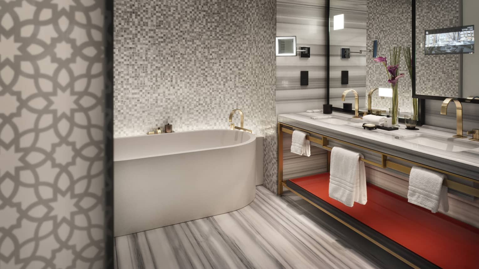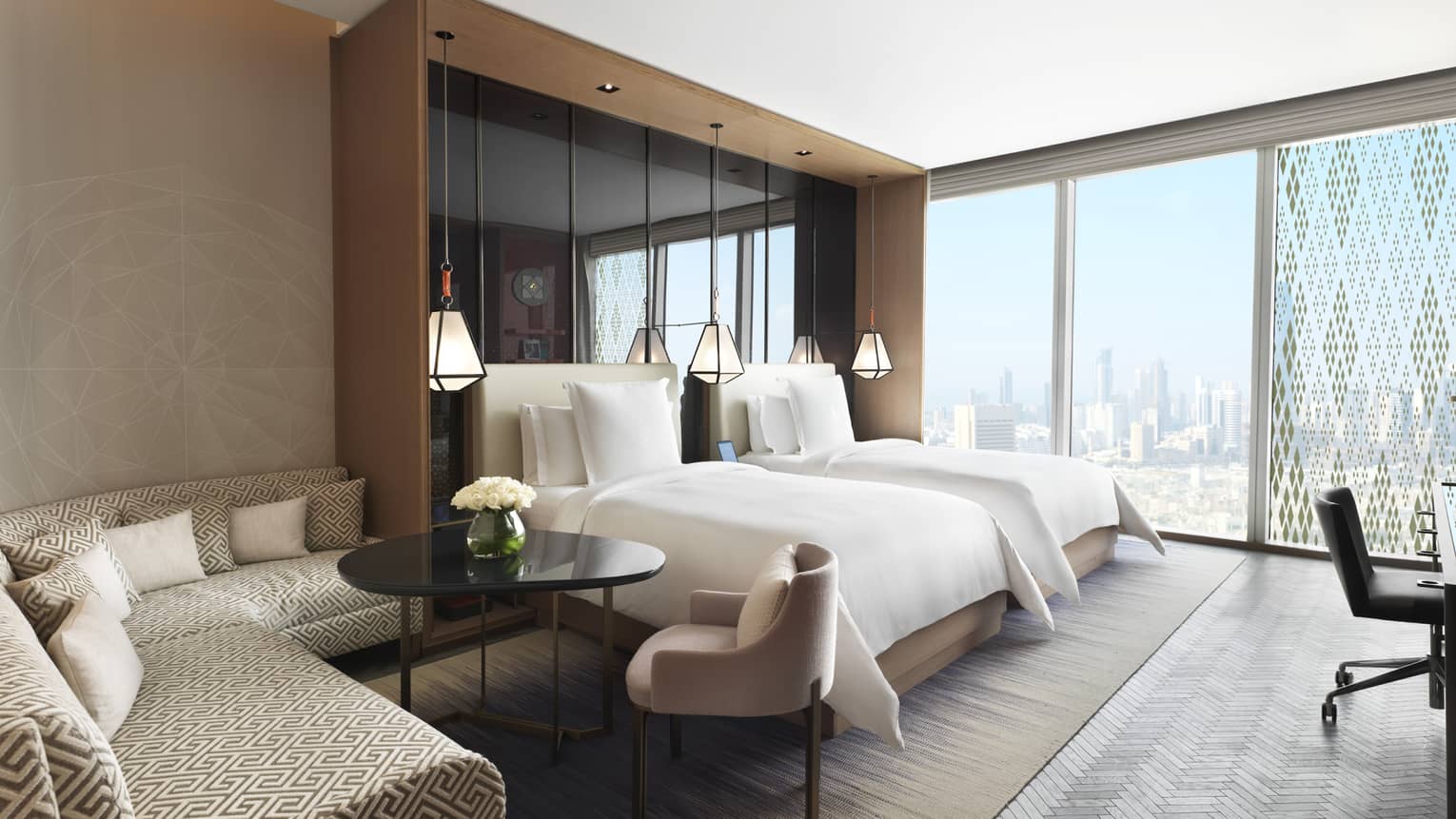With pool views and city vistas from the fifth to nineteenth floors – stretching to the Gulf in the distance – these serene havens of design include a sitting area and large marble bathroom with a free-standing tub and in-mirror TV. Connecting and twin bed options are also available.