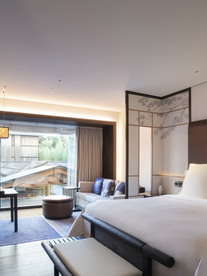 These are the largest standard guest rooms in Kyoto. Relax in the serene sitting area, or beneath the soothing seasonal scenes painted on the bed’s headboard. Your window may be opened to bring in the fresh breeze.