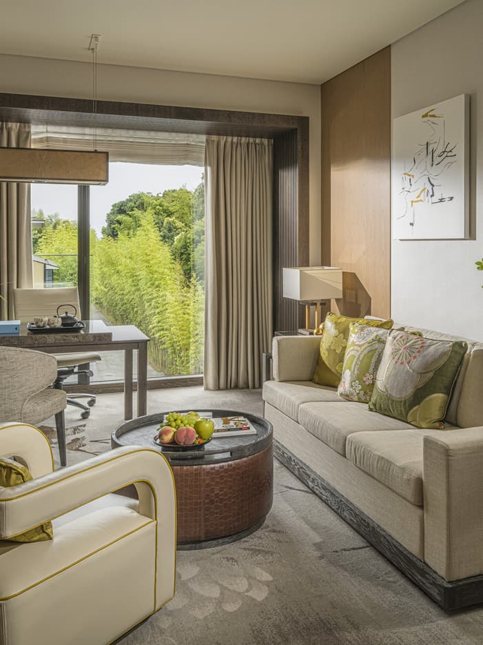 Our One-Bedroom Suite showcases a beautiful blend of traditional and modern designs, featuring a dining room, a living area equipped with a marble working desk and a separate bedroom. At the end of the day, unwind in the tranquil bedroom, where the Four Seasons Bed promises ultimate comfort.