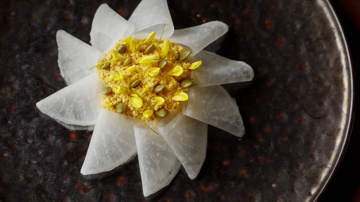 Delight in the abundant gifts of the Sea of Japan and earthy Kaga vegetables, artfully brought together in our curated course menu. For dessert, savour a crème brûlée infused with Kanazawa’s signature lightly roasted Kaga Bōcha tea and a sweet potato creation crafted from the prized Gorojima Kintoki variety. Four-course lunch: JPY 7,000; five-course lunch: JPY 10,500; five-course dinner: JPY 17,000.