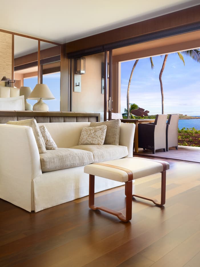 Claim one of our most requested suites as your own for a truly memorable Hawaiian vacation. Ideal for families or couples, these one-bedroom suites feature a separate living room and bedroom, two full bathrooms, a dining table for four and a private lanai that looks onto the Pacific Ocean.