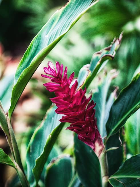 Stroll through 12 densely plotted acres of gardens that contain a variety of plants, including cycads, palms, bamboos, ferns, orchids and anthuriums. The tropical herbaceous Alpinia purpurata, or red ginger, shown here flaunts red bracts that may look like the bloom, but the true bloom is the small white flower on top.