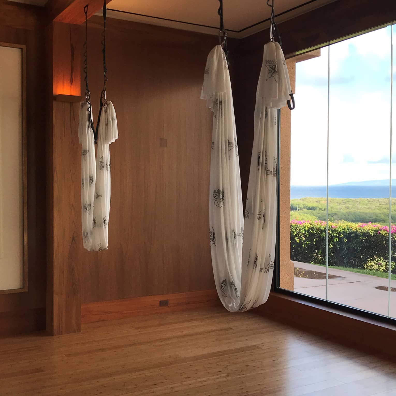 Aerial YogaTen suspended, silk hammocks welcome all skill levels for fun and liberating AntiGravity Yoga sessions that can help reduce stress and pain while restoring length and openness in your spine. Our multifaceted instructors offer a variety of indoor and outdoor classes, including complimentary sessions, listed in the daily schedule.