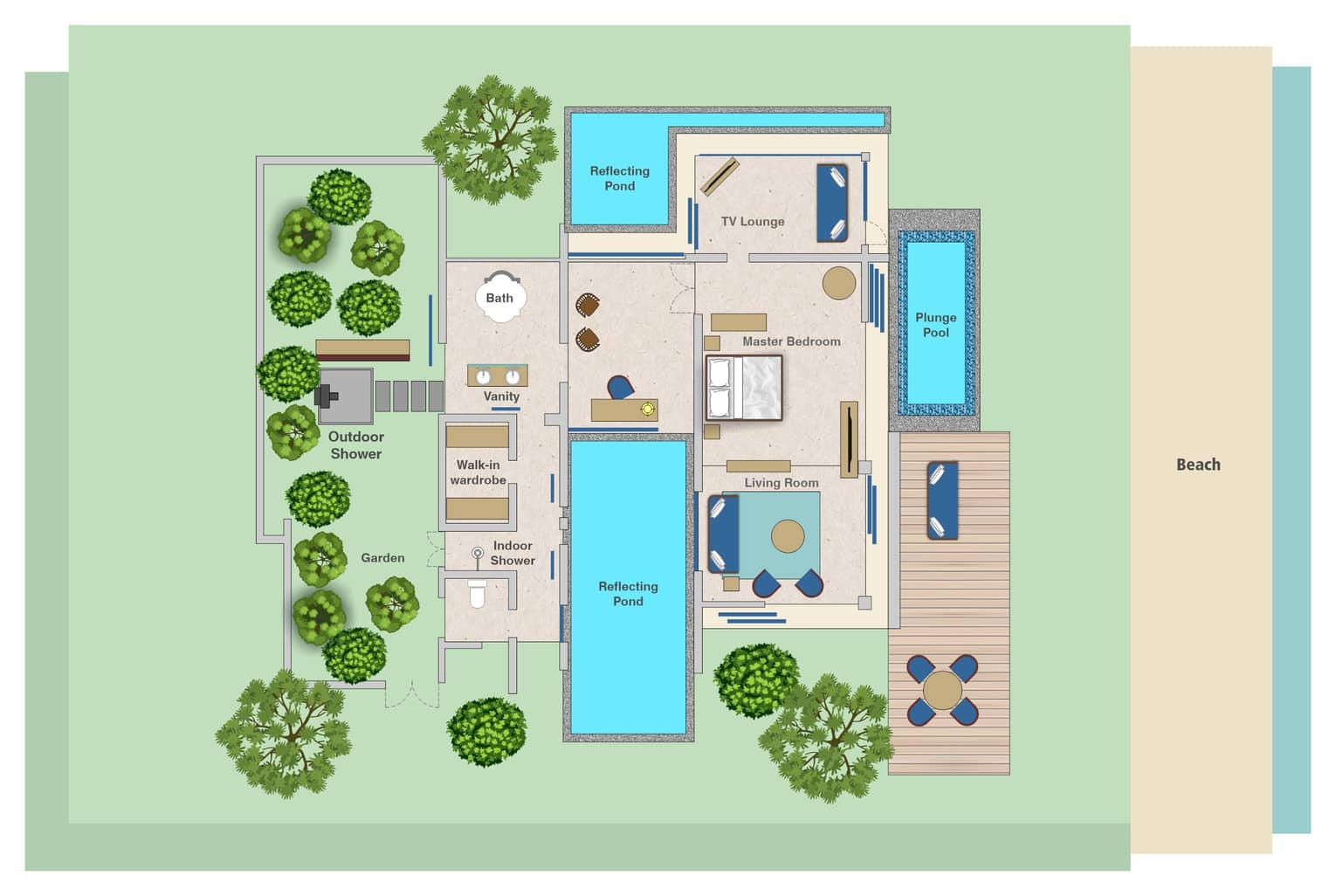 Indoor-Outdoor LivingOpt for the breezy sea-view daybed and outdoor dining area of your raised poolside deck, relax on the comfy sofas of your air-conditioned lounge, or retreat to the cool comfort of your private study overlooking the reflecting pond.
