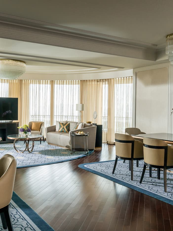 Soft carpets, eye-catching art and room to spare are the hallmarks of these suites, which are designed for entertaining and offer panoramic city views from floor-to-ceiling windows.