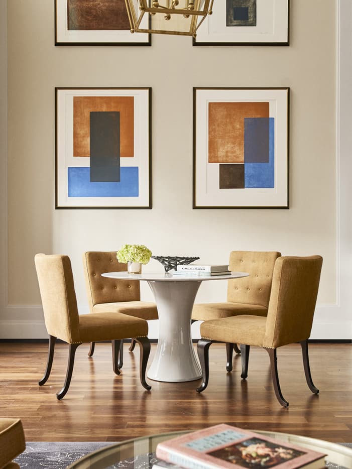 This diptych, located in a two-bedroom suite, is painted with the impasto technique that uses alabaster powder as the prominent feature. The colour palette is very warm with a predominance of earth tones – playing with different textures inspired by heating, cooling and breaking.