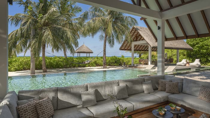 Walk off the beach and through a turquoise gate to come home to your walled beachfront villa, where a private lap pool flanked by a cushioned daybed, an open-air living and dining pavilion, and an island-style bedroom sit surrounded by tropical foliage.