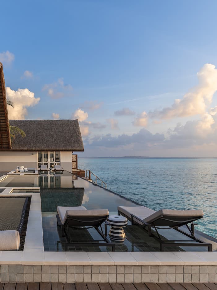 Our ultimate ocean-based accommodation showcases the evolution of over-water living. Vast outdoor decks feature a sunken living-room and palm semi-submerged sun loungers, while the master circular bath is just the start of the luxurious interior extras.