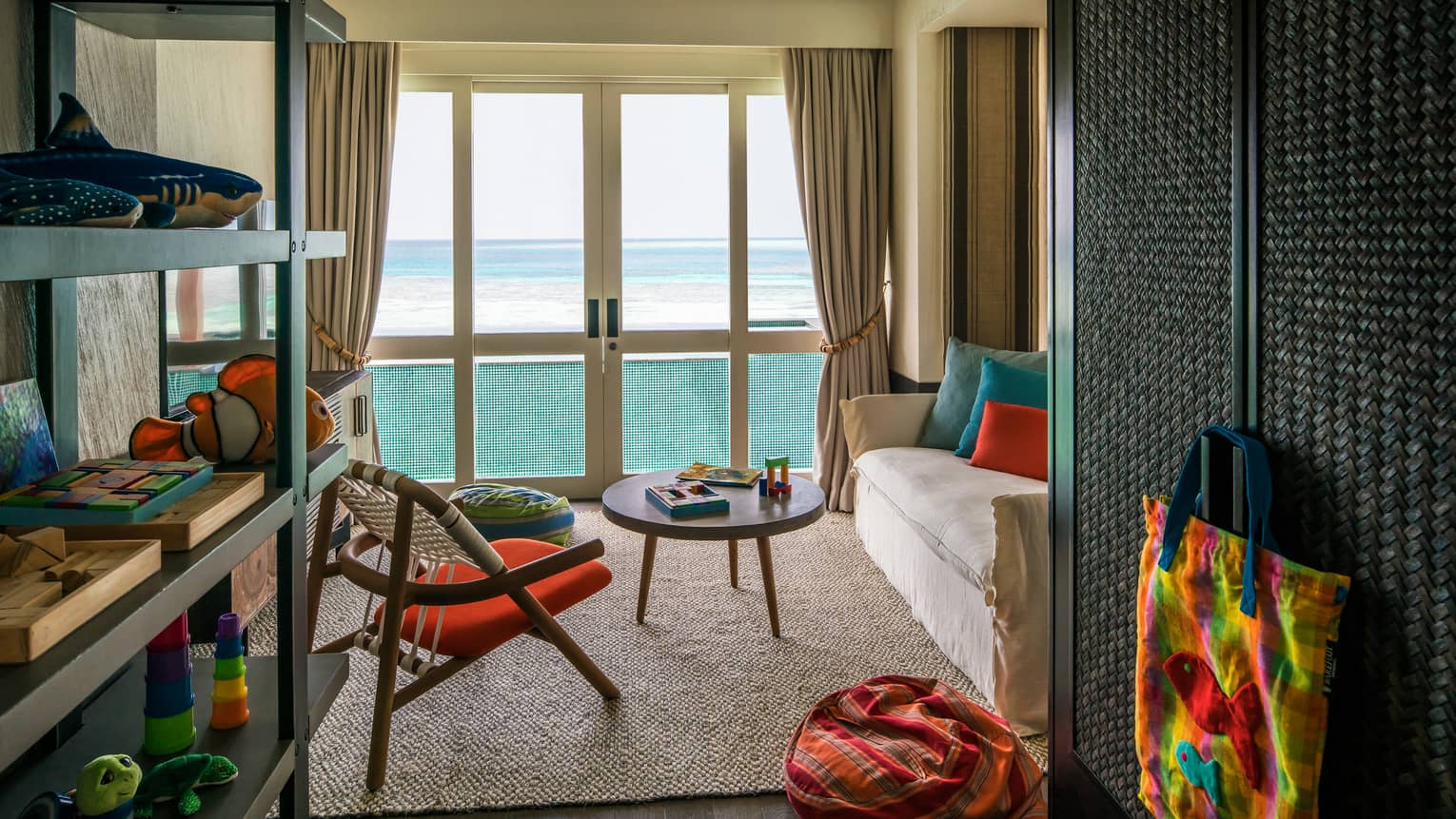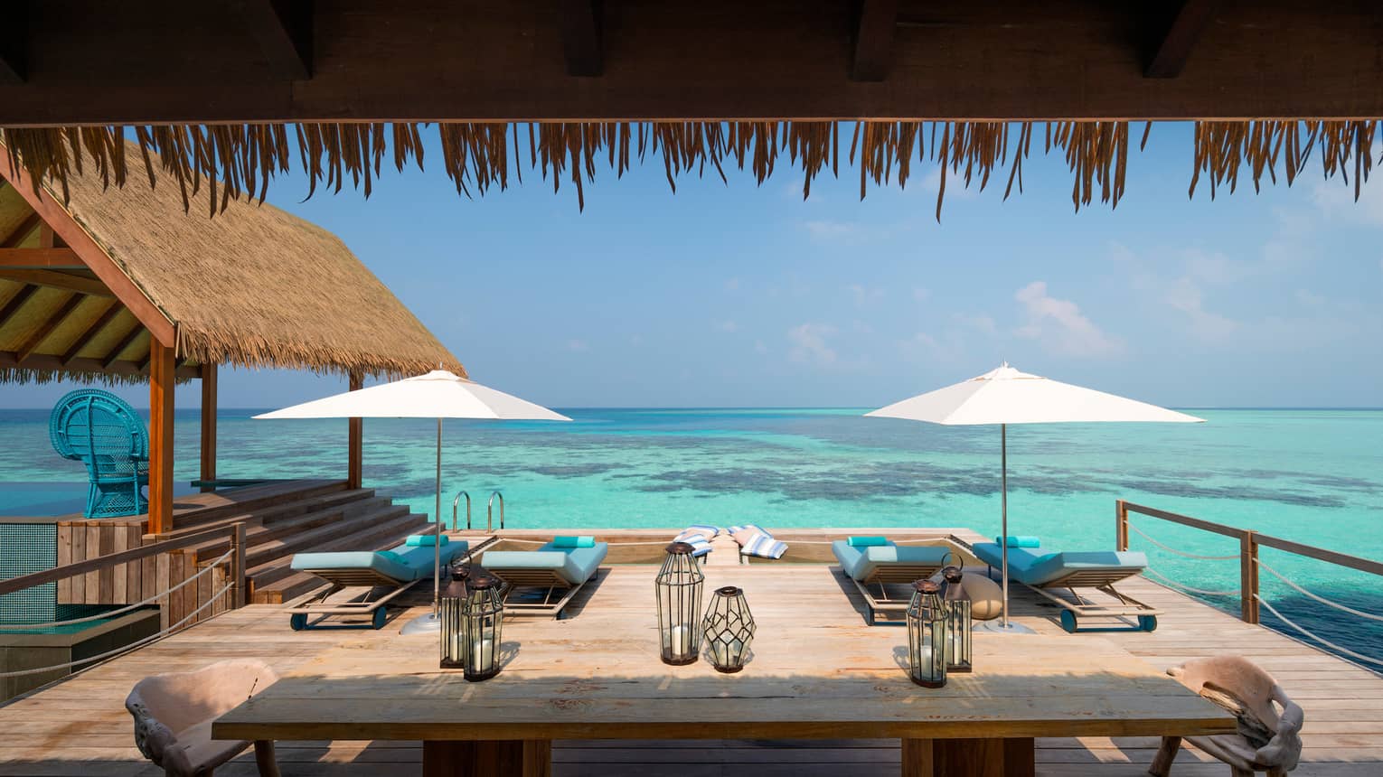 Indoor-Outdoor LivingThe air-conditioned living room opens onto an al-fresco living deck with a a 17-metre-long (56-foot-long) sunset pool, a dining table, loungers, hammocks and steps that lead you down into some of the atoll’s clearest waters.