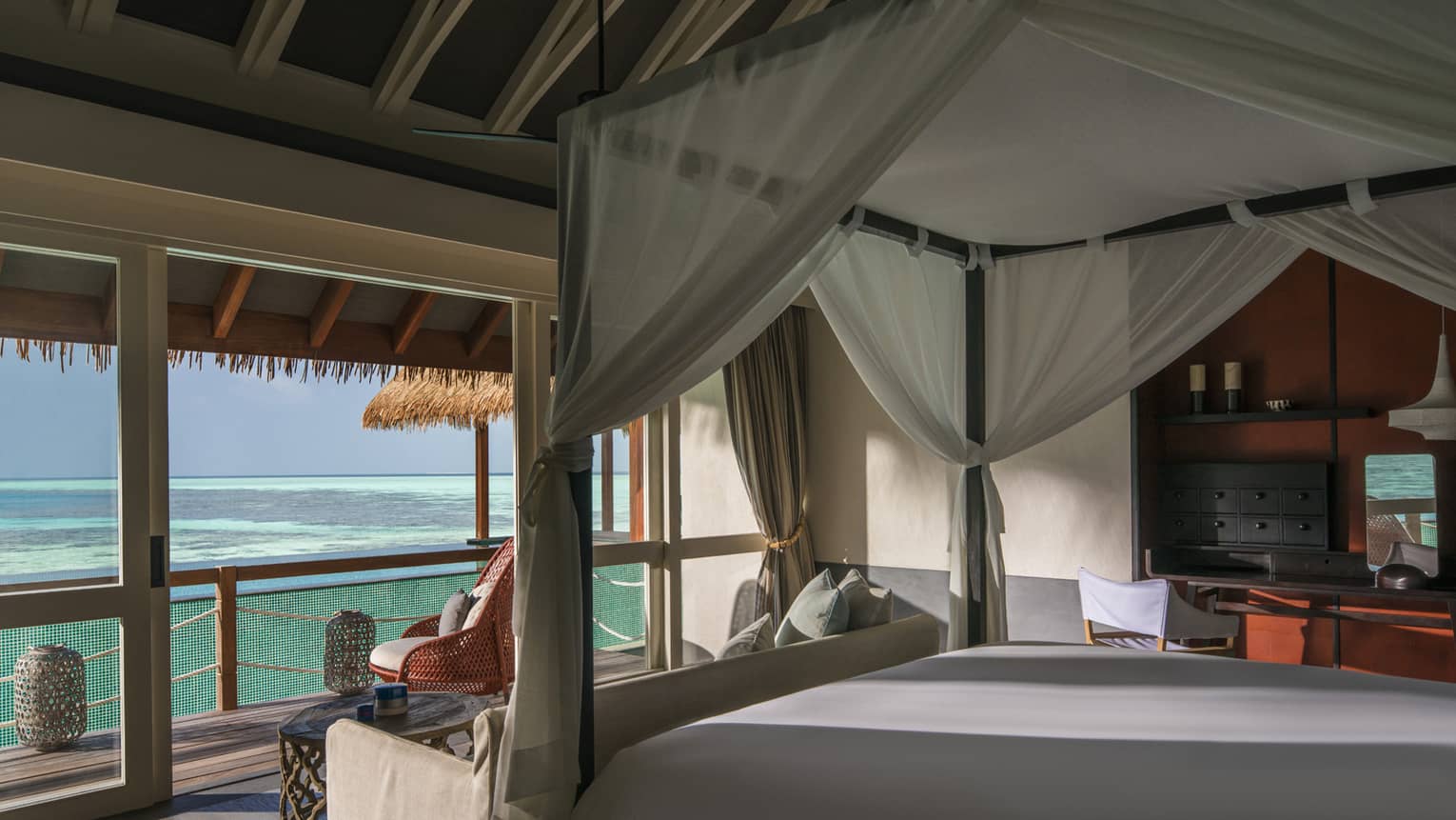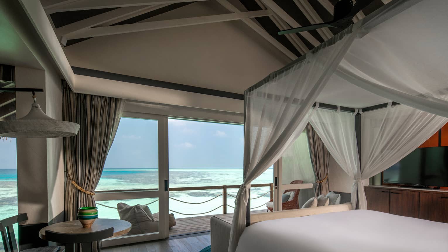 Stilted above the fish-filled lagoon, this two-bedroom villa features a master bedroom with an attached study or children’s room, as well as a separate, king-size bedroom pavilion. Relax in the air-conditioned living room, on the al fresco deck with a 17-metre (56-foot) sunset-view pool, or on a lounge chair or hammock. Steps lead down into some of the atoll’s clearest waters for snorkelling, turtle safaris or simply floating above the kaleidoscopic reef life.
