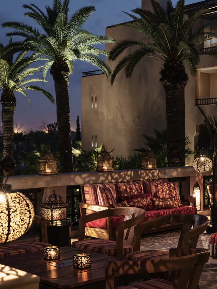 Gather with family and friends for a 360° experience in the heart of our Resort’s gardens with views of the Atlas Mountains and city gardens. Providing relaxation and socializing, our rooftop destination features creative cocktails and eclectic bar bites, whether enjoyed at high tables or in chic seating.