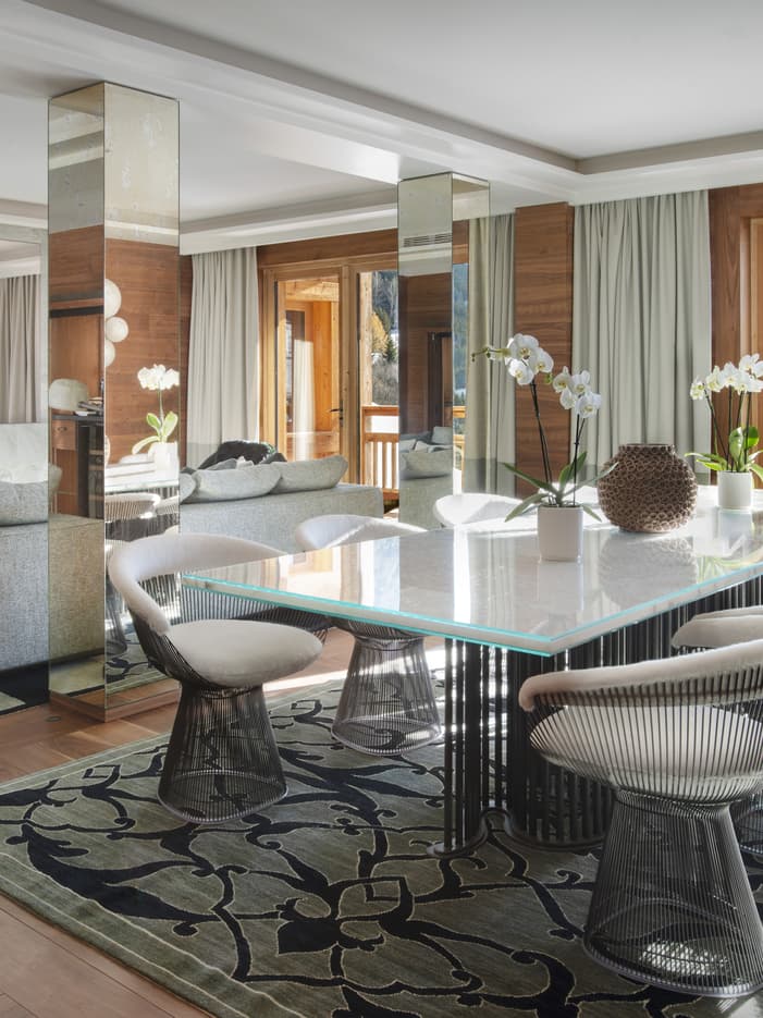 In contemporary style, where the alpine warmth of wood meets green tones, the Suite Mont Blanc brings together family and friends. Enjoy the privacy of this five-bedroom suite spanning the entire fifth floor of the Hotel. Seven exterior balconies offer an exceptional view of the mountain and the valley, while two separate dining rooms and living rooms allow you to meet and relax.