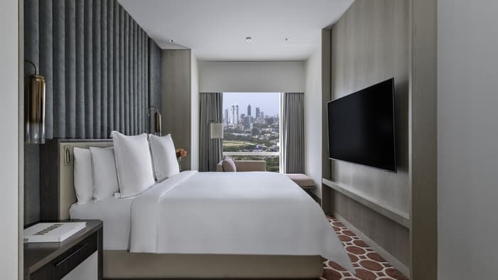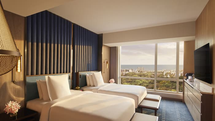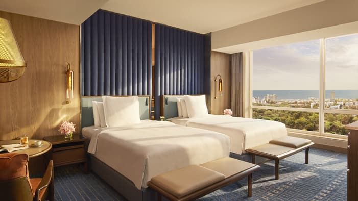 Offering views of the city and the sea, our recently renovated hotel rooms and suites exude elegance and sophistication, with designs inspired by the richness of Indian colours and textiles, paying homage to the textile districts of Mumbai.