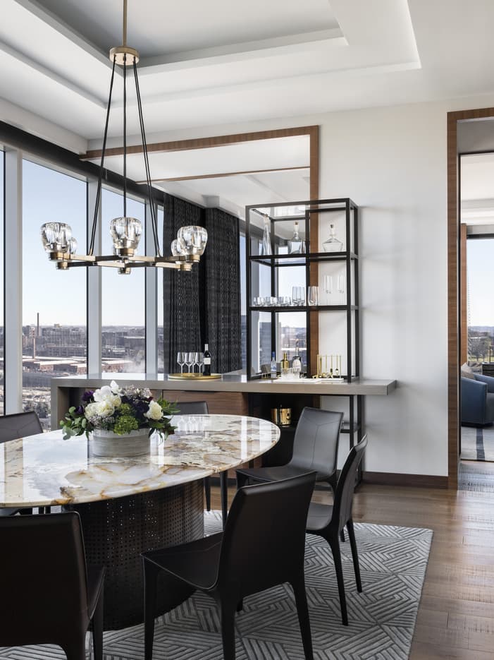 Boasting panoramic views of downtown Nashville's vibrant scene, our expansive Presidential Suite is unforgettable and ideal for entertainment. Your experience is enhanced with a dining table for eight, seating and media areas, a powder room for guests and a private bar. A lavish bedroom includes a large dressing area and a sunlit ensuite bath.