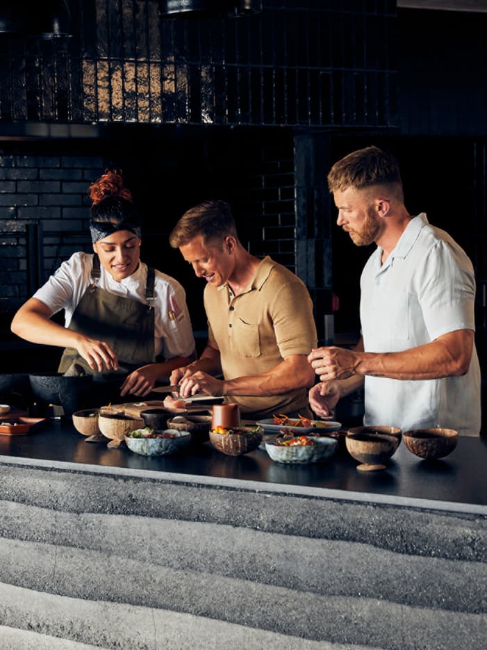 Here, dining flows with your day – no schedules, no set menus. Inspired by the land and our own gardens, each meal is created with heart, to be enjoyed at your pace. Our open-air restaurant celebrates ancient open-fire cooking, where smoke and flame bring flavours to life. Also, enjoy 24/7 dining directly in your bungalow. Whether poolside, in your bungalow or beneath the stars on the beach, every bite is a simple invitation to savour the moment.