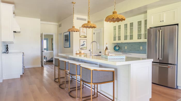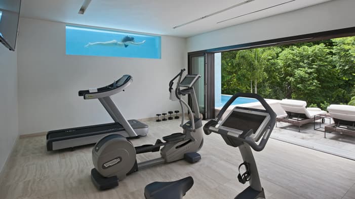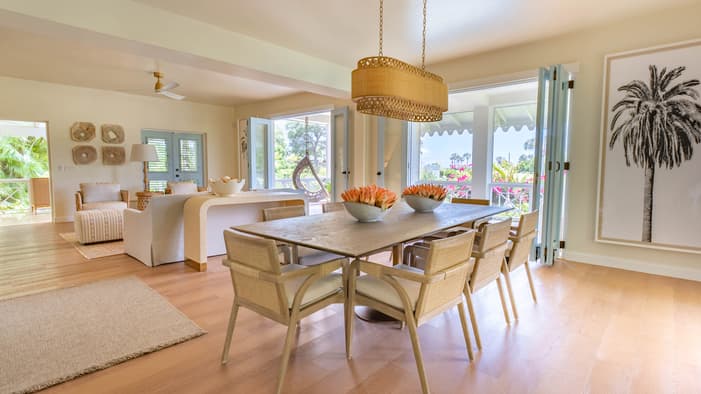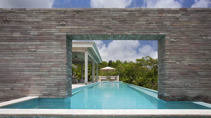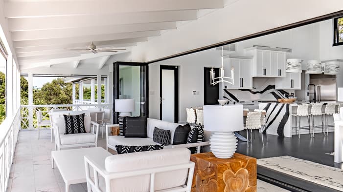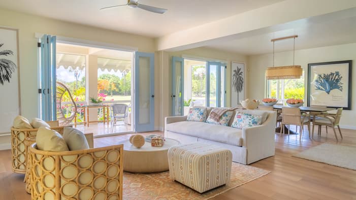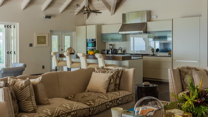 Chic, two-level, sun-filled spaces, these three- and four-bedroom luxury villas in Nevis, West Indies encourage indoor-outdoor living with panoramic views of Nevis Peak and the golf course – just a three-minute walk to the beach.