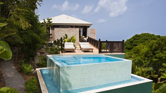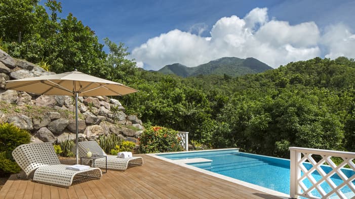 A true island hideaway on the slopes of Nevis Peak, these unique one-bedroom studios offer the perfect place to unwind in nature – just eight minutes by golf cart ride to the beach.