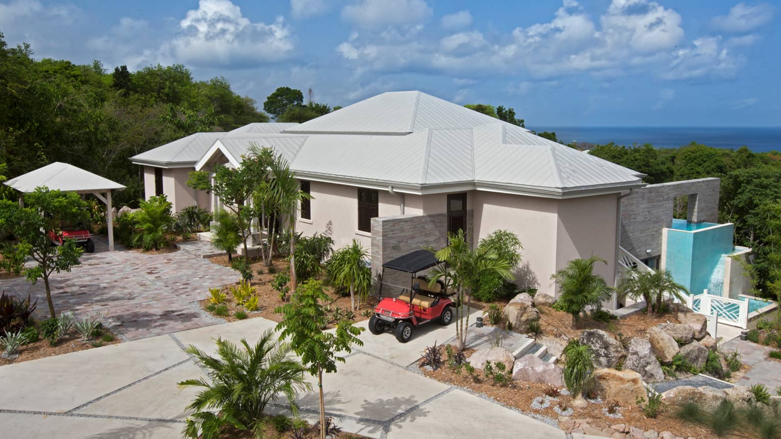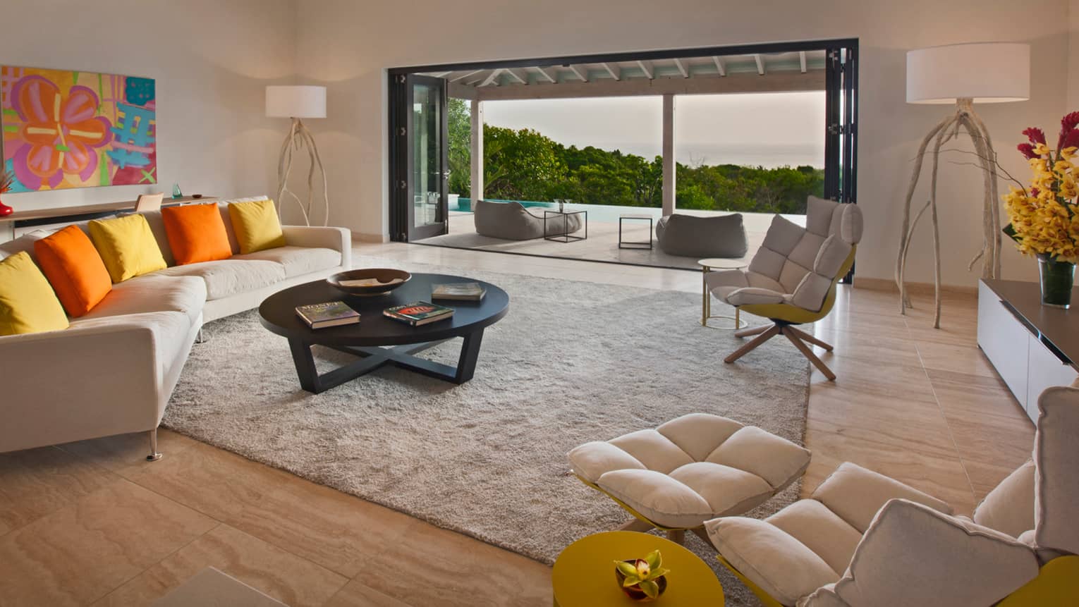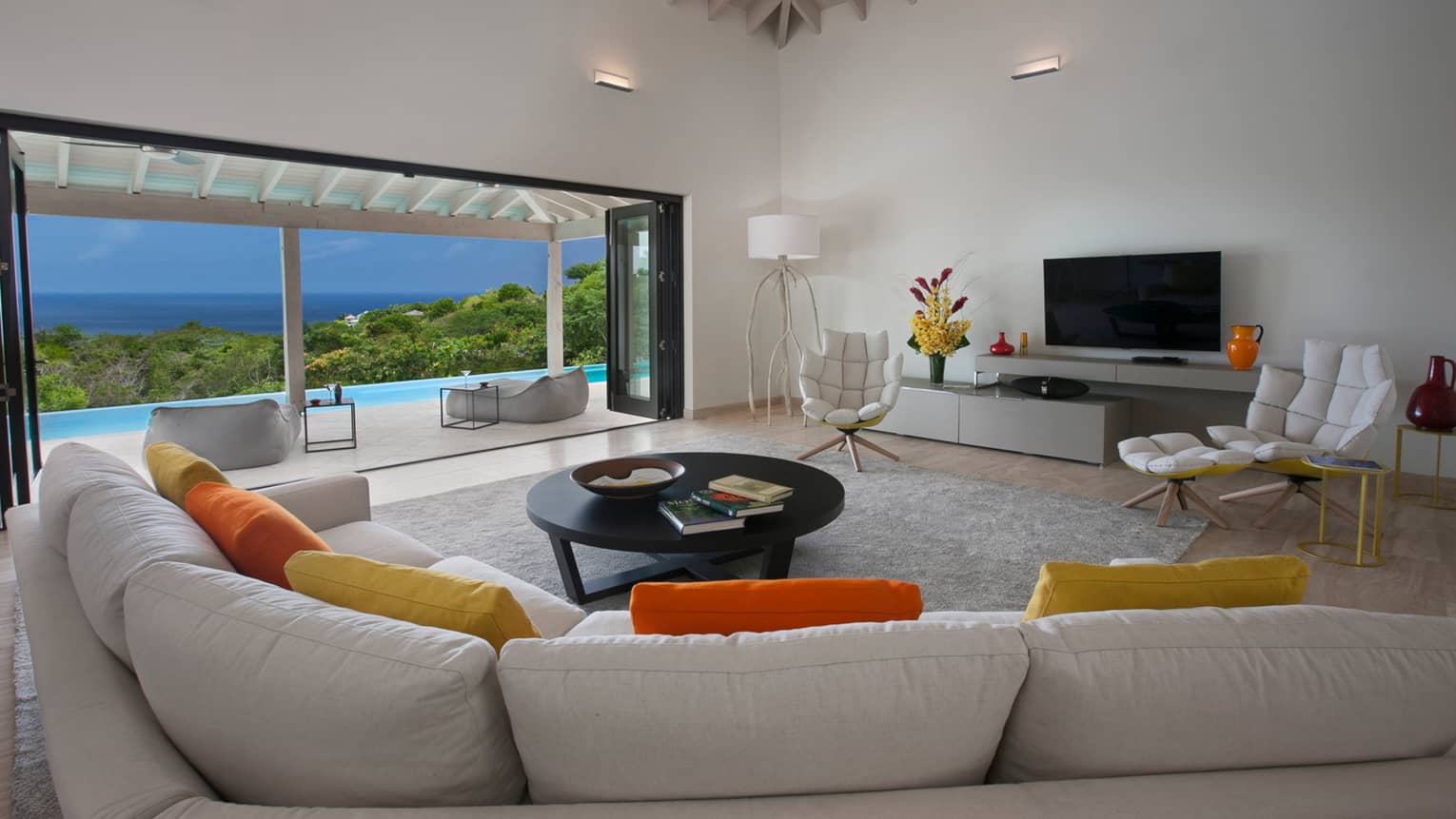 With a private couple’s massage room and personal gym, as well as an extra-long infinity-edge pool and stunning views of the Caribbean Sea, Nevis Peak and St. Kitts, privacy and personalization are on order in this modern two-bedroom villa.