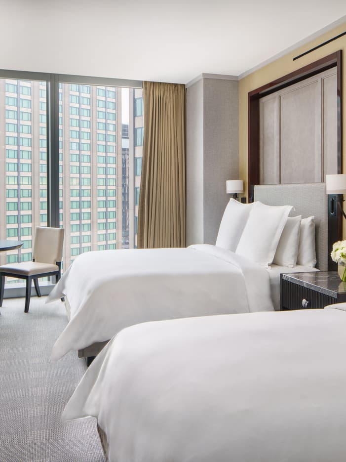 This thoughtfully designed contemporary space offers modern touches and floor-to-ceiling views of Back Bay. Complete with two queen beds, a spacious bathroom and deep-soaking tub, this room is perfect for staying with family or friends.