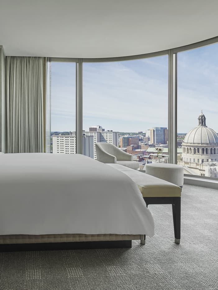 Discover our Back Bay suite in Boston. This circular, luxury corner suite features floor-to-ceiling windows, providing natural light and stunning city views. Unwind in the airy, modern living area, then retreat to the spacious bedroom with its sun-drenched en suite bathroom.