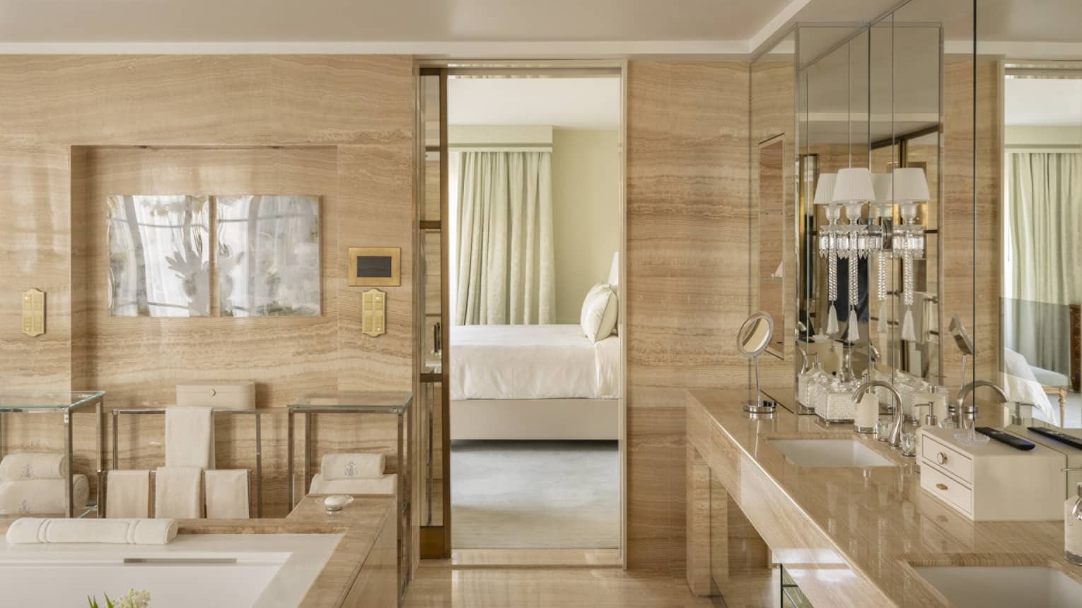 Light, airy and supremely inviting, the suite features travertine flooring and walls accented with Majilite and sycamore.
