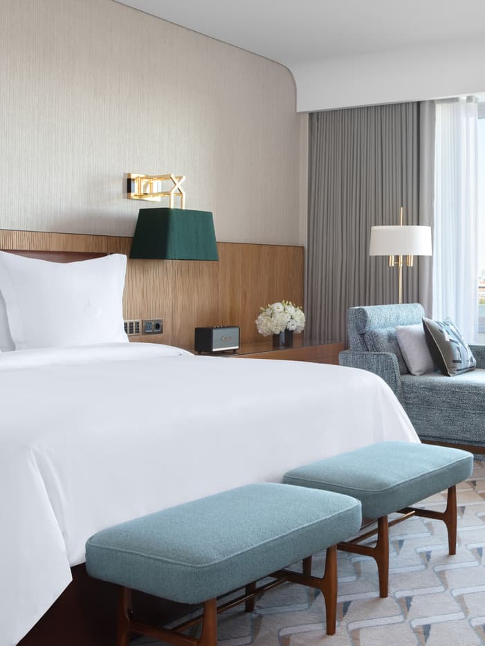 Quartos confortáveis inspirados nos anos 50, com varandas privadas perfeitas para o café matinal. Envoltas de significado, as cadeiras luxuosas em veludo azul-esverdeado, modelo original da Sala de Jogos do Hotel de 1959, que conferem charme e elegância ao ambiente.