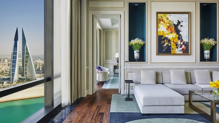 В гармонии с окружающим пейзажемИнтерьер гармонирует с окружающим пейзажем благодаря мягкой палитре бежевых, зеленых и золотистых оттенков, имитирующих растительность острова Бахрейн.