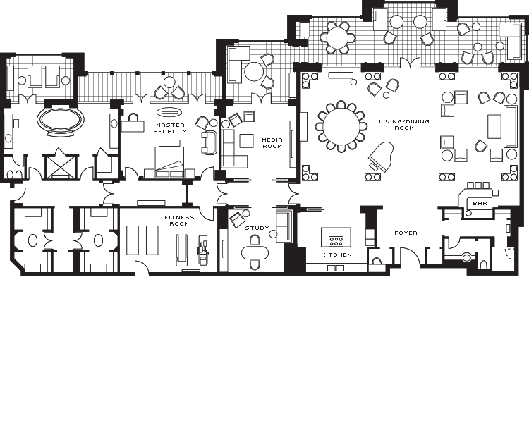 Отдельный лифт доставит вас на крышу отеля к дверям самого роскошного из наших номеров. Просторные комнаты с мраморными полами и монументальными колоннами, купающиеся в лучах солнечного света, резко контрастируют со сдержанной элегантностью деревянных панелей и строгой, но уютной обстановкой рабочего кабинета и домашнего кинотеатра.