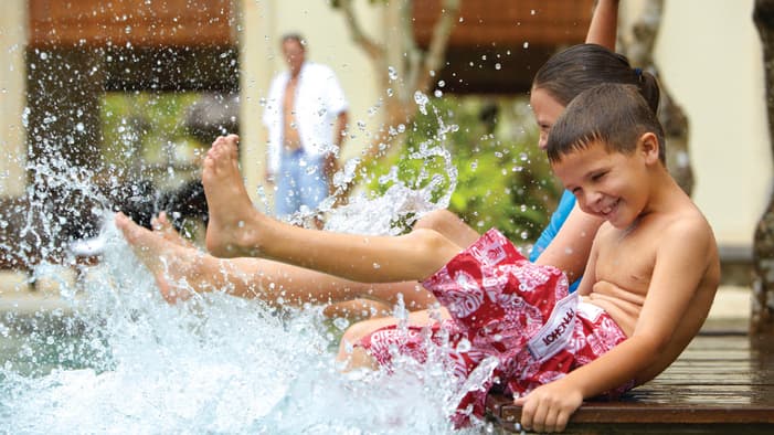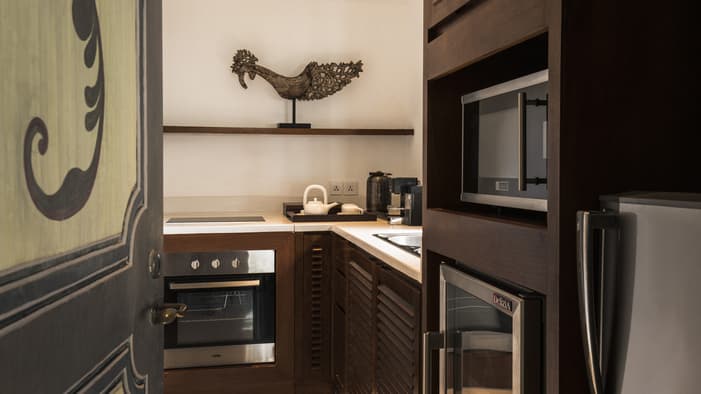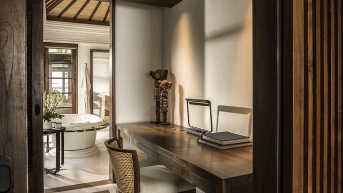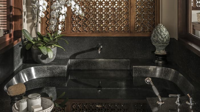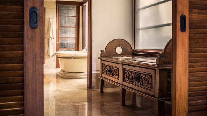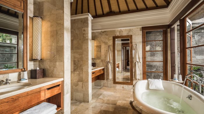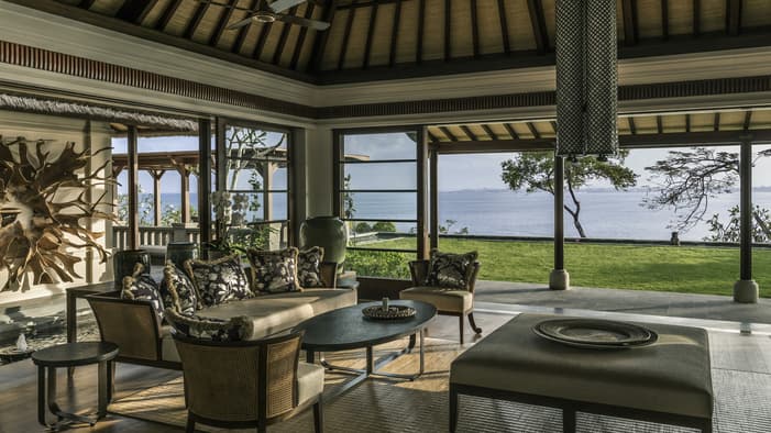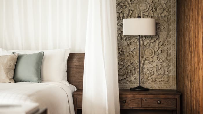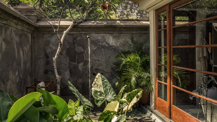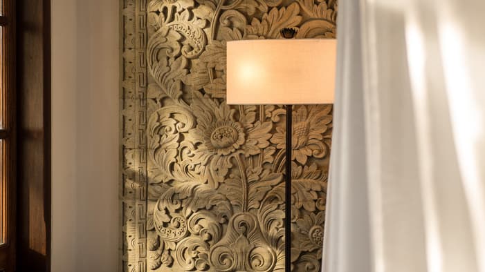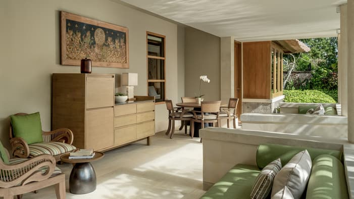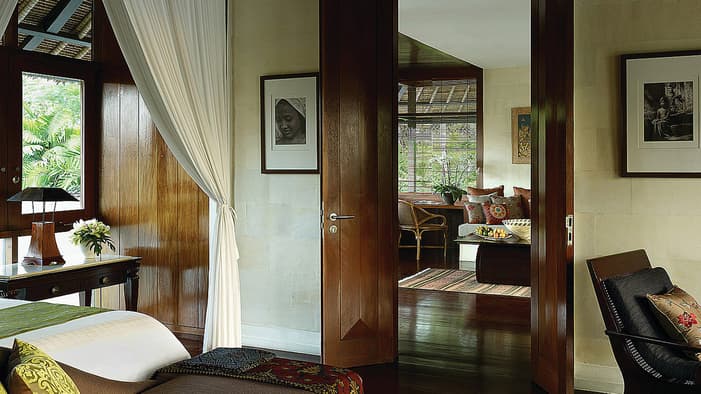Местные материалы, в том числе лампит и ткань икат, соломенные крыши и деревянные полы создают неповторимую атмосферу, а деревянные панели, созданные знаменитым резчиком Мэйдом Джоджолом, придают обстановке особый балийский шарм.