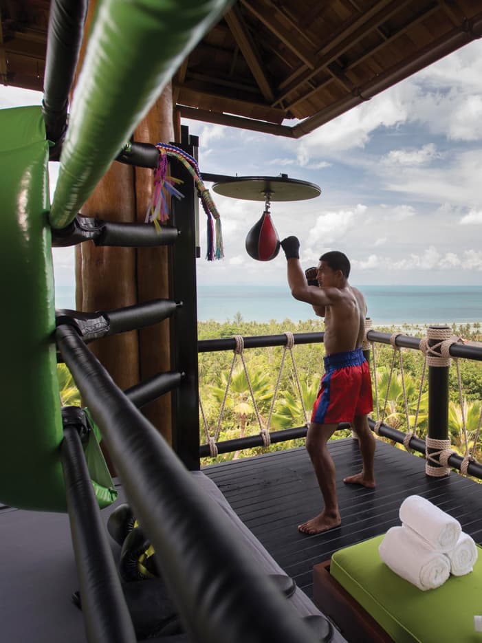 Познакомьтесь с одной из самых ярких традиций Таиланда — тайским боксом, также известным как муай-тай. На нашем открытом тренировочном ринге, расположенном на вершине холма, с которого открывается потрясающий вид на Сиамский залив, вы можете брать уроки у профессионального бойца (независимо от вашего возраста и уровня подготовки), участвовать в групповых тренировках или отрабатывать навыки самостоятельно.