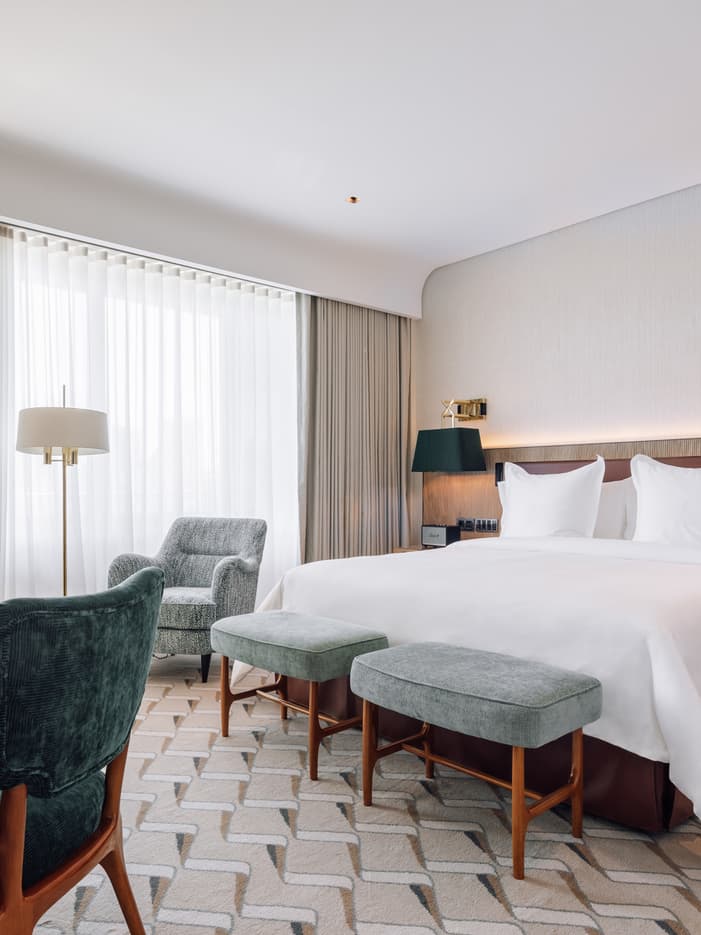 Эти комфортабельные номера с видом на город, оснащенные по последнему слову техники, оформлены в стиле 1950-х — так мы отдаем дань уважения славному прошлому нашего отеля.