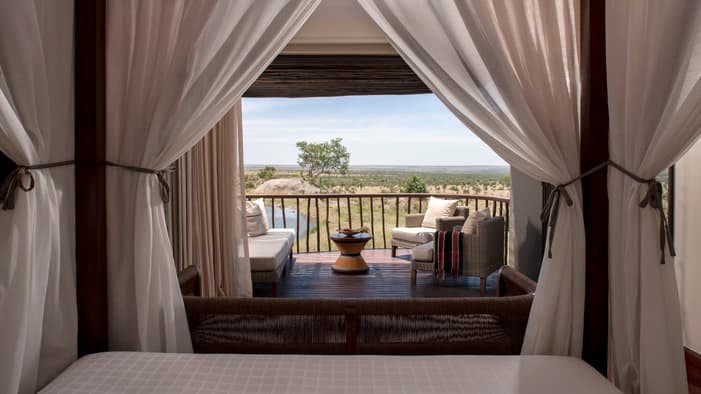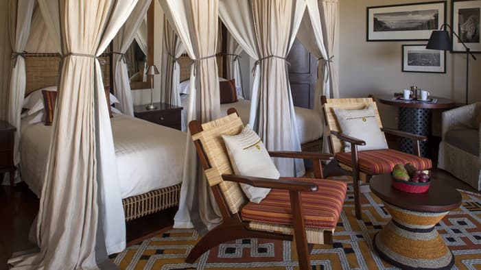 Each of these spacious accommodations features a balcony with direct views out across the savannah or the neighbouring waterhole. The Lodge’s spacious rooms include four-poster beds and are furnished with local textiles and artwork.