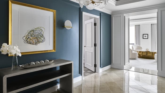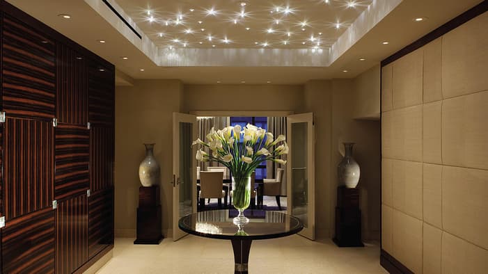 Интерьеры оформлены в приятной цветовой гамме из мягких нейтральных оттенков белого, нежно-жемчужного и серого, контрастирующих с оттенками кораллового, персикового и шоколадного. Такое оформление прекрасно гармонирует с богатыми коричневыми тонами нейтрального вестибюля, над дизайном которого работал Пьер-Ив Рошон.