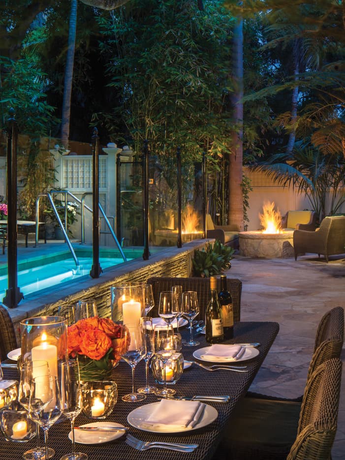 Outdoor livingLit with candles and hanging lanterns come nightfall, the Bungalow’s private patio – complete with fountain, a 20-foot heated plunge pool with whirlpool jets and bench seating, chaises lounges, dining table and firepit – is an idyllic place to spend cool, peaceful nights in the American Riviera.