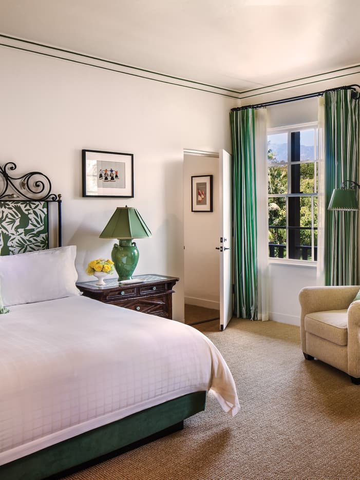 Colourful Mexican art and green-and-white upholstered headboards with hand-woven Otomi fabrics nod to the verdant views outside, while floor-to-ceiling windows in both the living area and bedroom let in an abundance of natural light in these bright and airy suites.