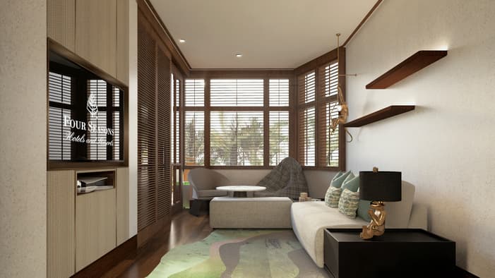 Each suite and villa is appointed with a mix of contemporary and Balinese décor, including rich teak furnishings and bold hand-loomed fabrics.