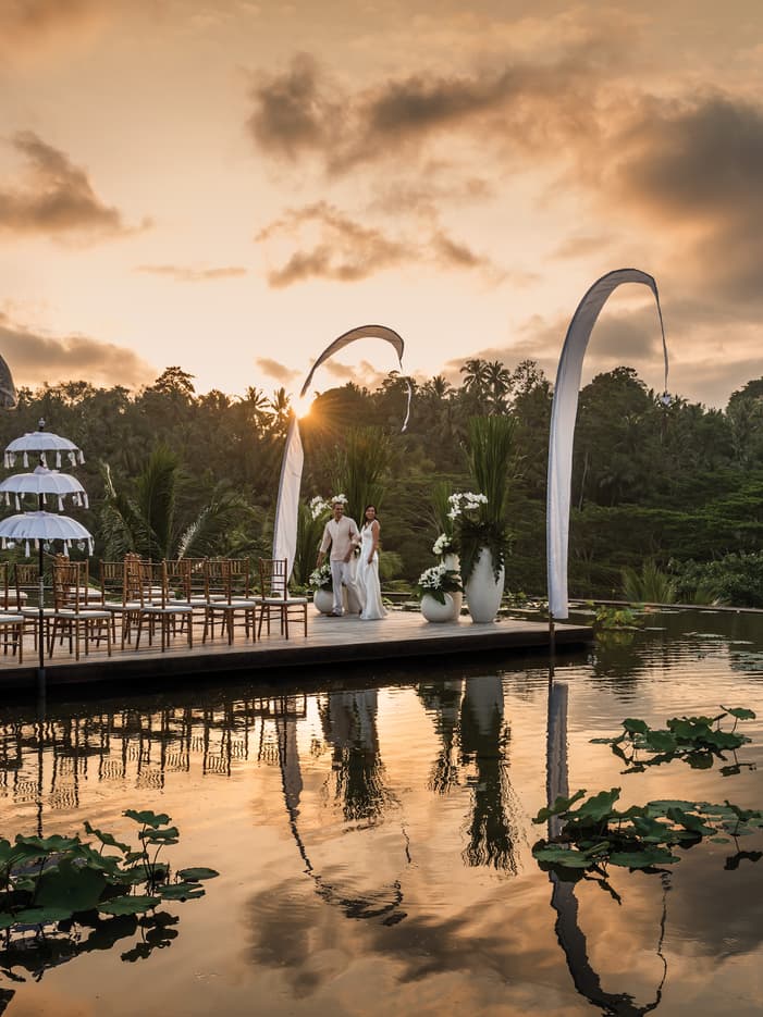 Idyllic Jungle VenuesMake a breathtaking entrance into our infinity-edge Rooftop Lotus Pond venue, surrounded by fragrant flowers. Or host an intimate gathering of canapés, Champagne cocktails and a traditional Balinese performance at Jati Bar and Ayung Terrace. Our secluded indoor-outdoor venues give you a variety of choices for your big day.