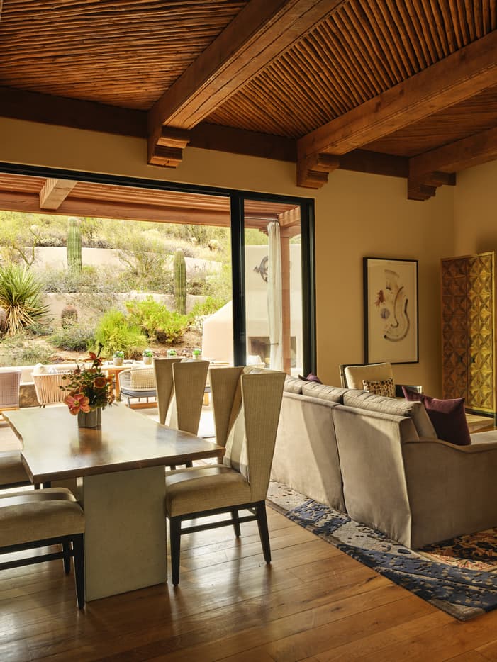 The warm tones of the surrounding Sonoran Desert welcome you in this expansive suite, perfect for multi-generational families and groups of up to nine people. Each bedroom offers its own indoor fireplace for a cosy night in. Spacious patios provide al fresco living opportunities year-round, featuring a private plunge pool, outdoor garden showers and a wood-burning fireplace for gathering together. Entertain with spacious common areas and a service kitchen, complete with a dining table for a celebratory meal.