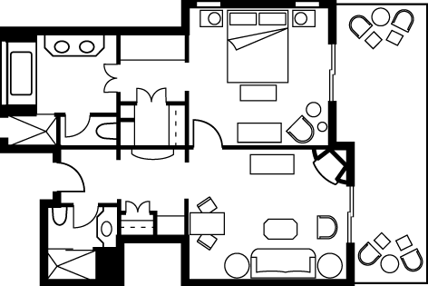 Wake up and smell the fresh air as you stroll onto the patio directly from your bedroom in these spacious mountain-view suites. The interior features a gas-burning fireplace, and the newly renovated bathrooms offer a deep soaking tub and separate shower. (Please note: these second-floor suites are set away from the main Resort and are accessible by a set of stairs with no elevator access.)