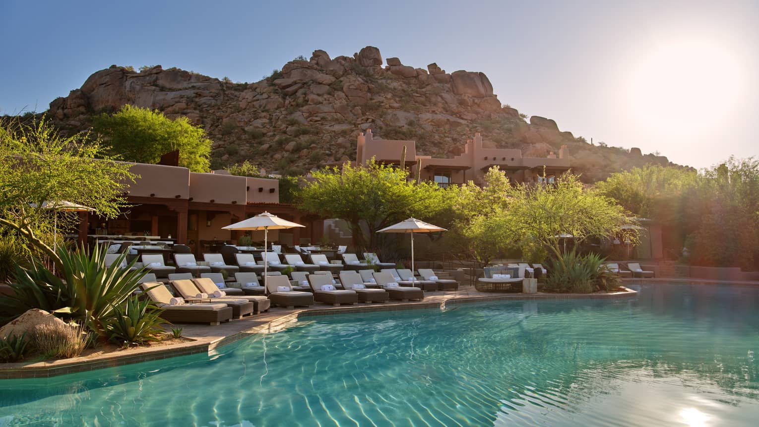 Pinnacle Three-Bedroom SuiteThe warm tones of the surrounding Sonoran Desert welcome you in this expansive suite, perfect for multi-generational families and groups of up to nine people. Each bedroom offers its own indoor fireplace for a cosy night in. Spacious patios provide al fresco living opportunities year-round, featuring a private plunge pool, outdoor garden showers and a wood-burning fireplace for gathering together. Entertain with spacious common areas and a service kitchen, complete with a dining table for a celebratory meal.