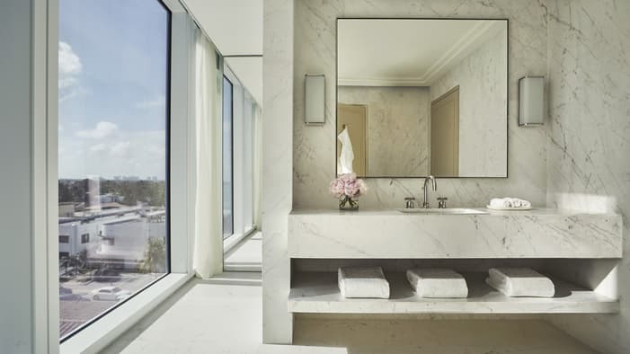 Parisian interior designer Joseph Dirand has created a refreshing colour palette, blending calming shades of light green, blue and white marble to ensure each accommodation echoes the classic Miami Beach combination of sand, sea and sun.