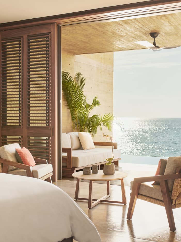 Perfect for beach lovers, this spacious suite features a large living room and separate bedroom – ideal for a family on vacation or a couple wanting extra space to unwind. Savour days in the sun beside your own personal infinity swimming pool perched above the sand, with up-close beach and ocean views.