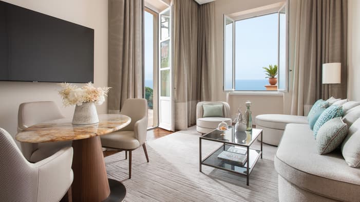 Entertain al fresco on your spectacular terrace overlooking the Ancient Theatre and the sea. With its generous indoor and outdoor living areas, and its private plunge pool or jetted tub, this one-bedroom suite is perfect for a small family.