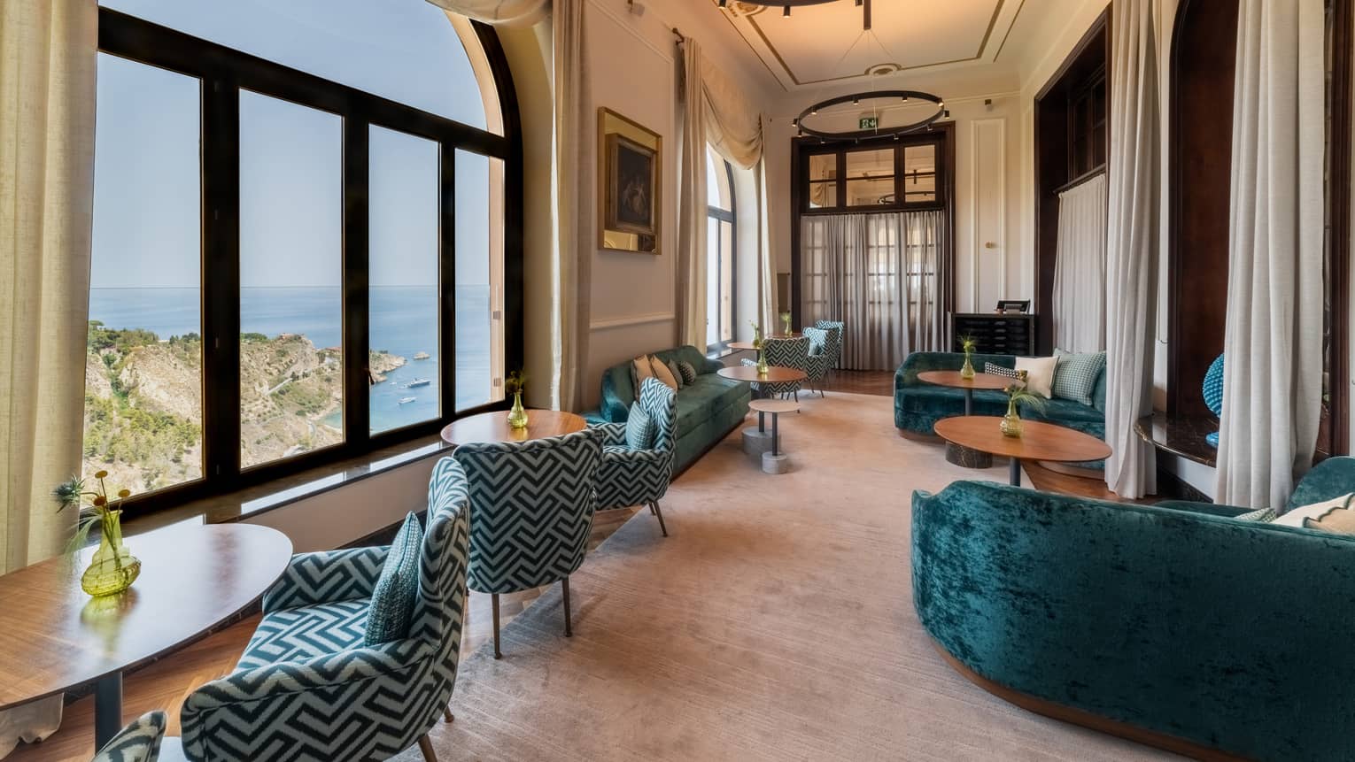 Sala IonioNestled in a cozy emerald-hued setting, Sala Ionio offers a truly intimate atmosphere with stunning sea views of Taormina Bay and the Ancient Theatre. Whether you’re enjoying a coffee, sipping a refreshing cocktail or indulging in a light meal, the serene area invites you to unwind and savour the moment.