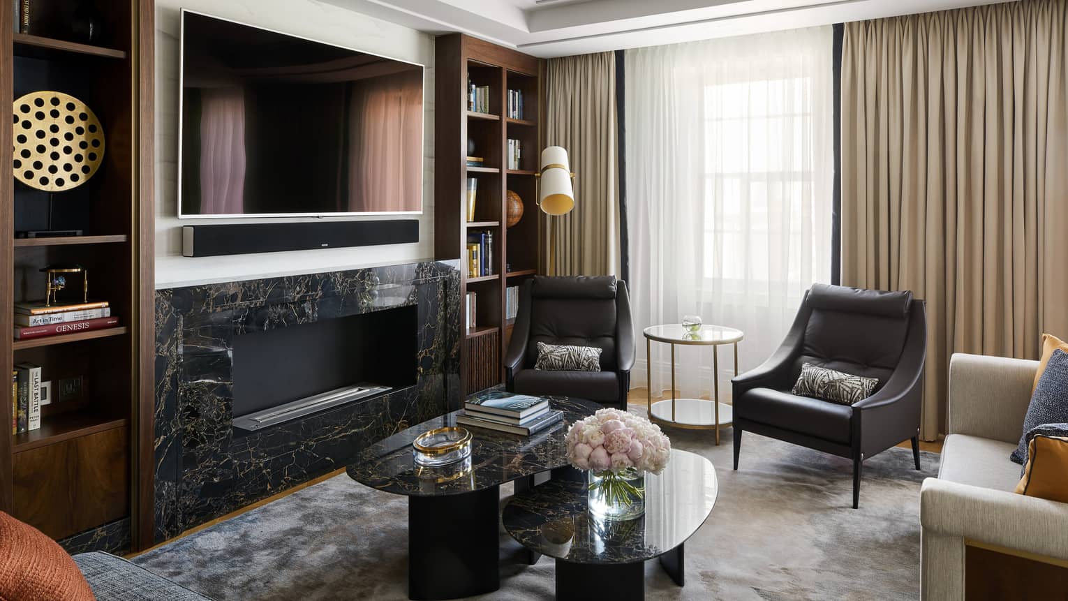 The Skyline PenthouseA four-bedroom Hotel residence featuring a private gym, cosy cinema room, elegant office, private garden and wraparound rooftop terrace.