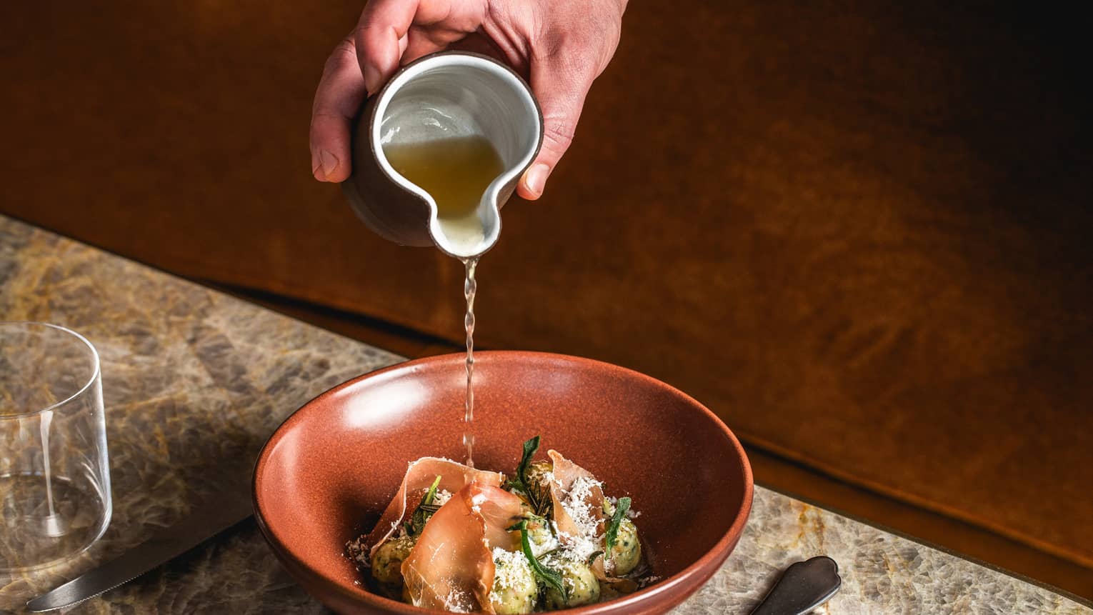 A traditional bread dumpling from Alto Adige, Canederli di Speck is served table-side with a rich, umami-packed prosciutto and parmesan brodo, accompanied by thinly sliced speck and house-smoked ricotta, for an immersive dining experience.