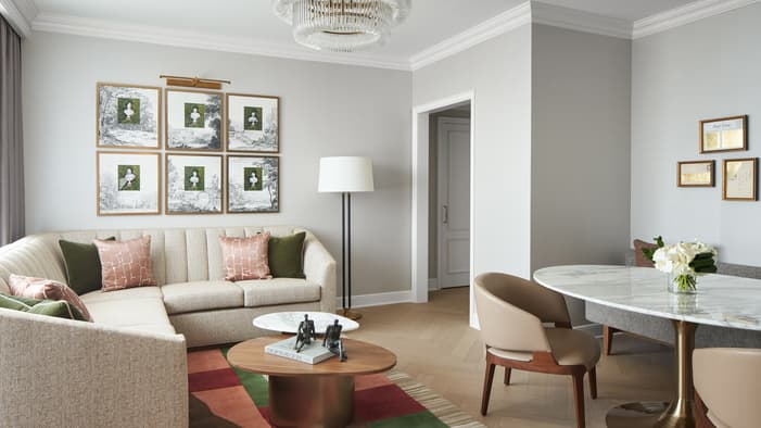 Capital Suite living room with long oval work desk in front of L-shaped sofa, pink armchair, corner windows