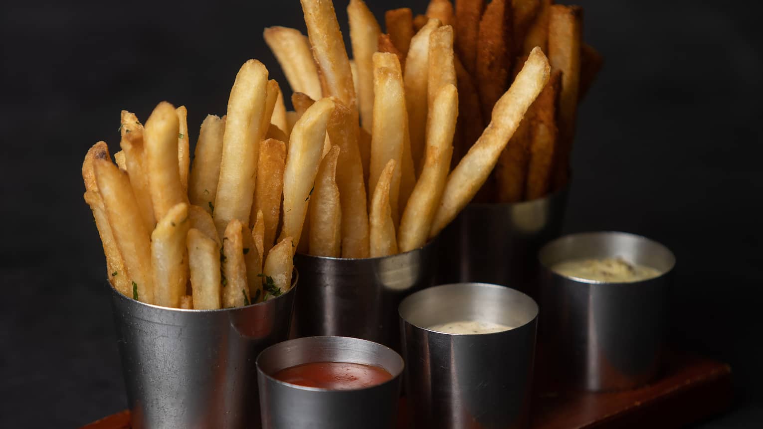 Sample Duck Fat Fries with three distinct flavours, each perfectly crisped and paired with an assortment of flavourful house-made sauces.